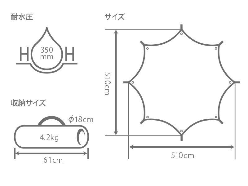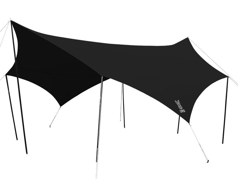 ポリコットン(ポリエステルとコットンの混紡生地)を使用した5.1×5.1mの超大型タープテントです。8ヶ所の全ての角にポールとグロメットを付けることができるため、状況に応じて自由自在に張ることができます。